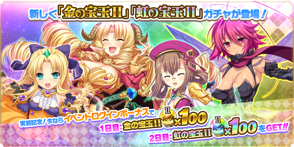 - 金の宝玉Ⅱガチャ、虹の宝玉Ⅱガチャの終了日は未定となります。本ガチャの終了タイミングは30日以上前に告知いたします。
