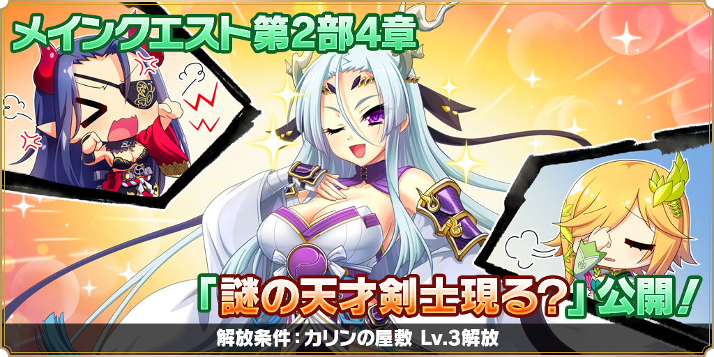 - 『第2部 第4章 謎の天才剣士現る?』は建国にて「カリンの屋敷」をLv.3にすることで解放されます。